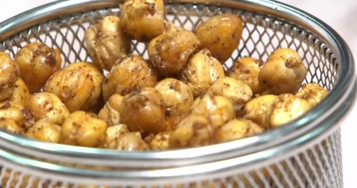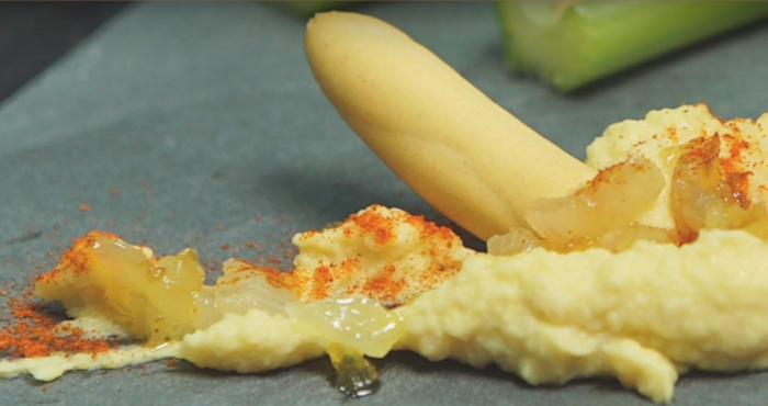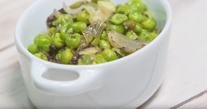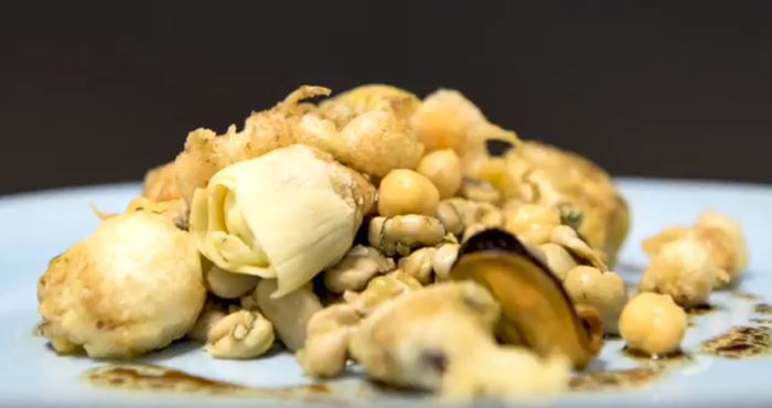 Habitas salteadas con garbanzos en tempura, alcachofas y mejillones