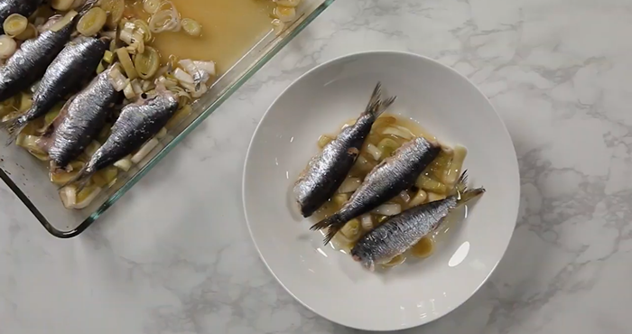 Disponer las sardinas sin espinas sobre el puerro y salpimentar. Hornear durante 15 minutos.